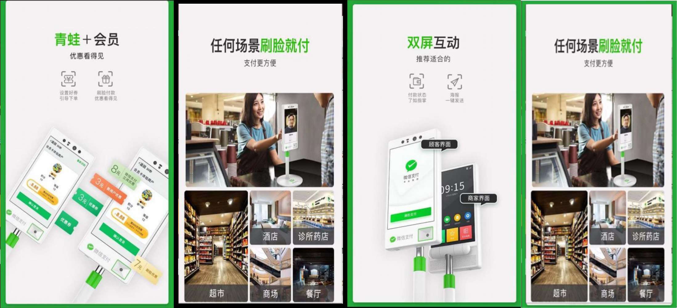 | 微信生態(tài) | 支持在微信青蛙Pro上運(yùn)行所有微信小程序;刷臉支付支持展示微信卡包相關(guān)信息,并提供非會(huì)員注冊(cè)入口及開(kāi)卡有禮功能。 |