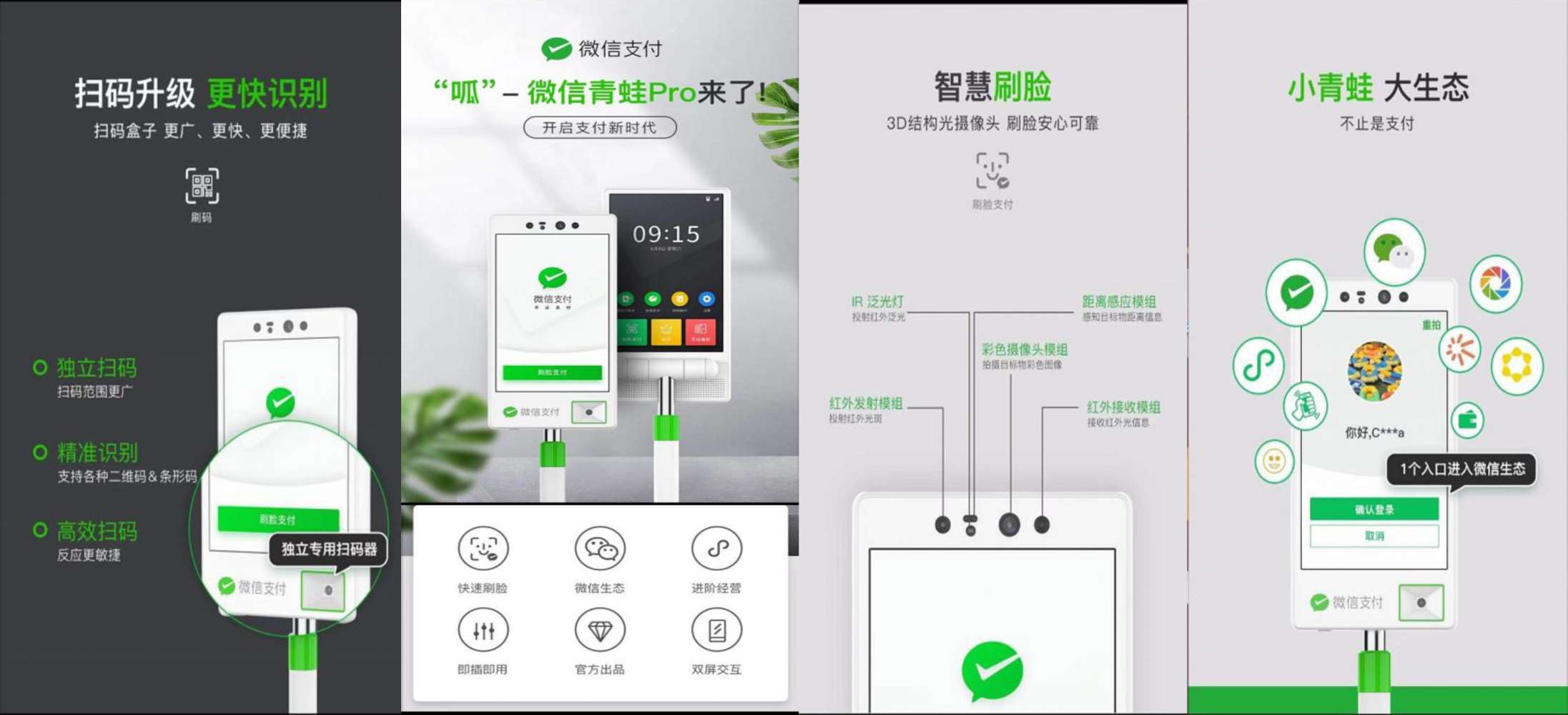 青蛙Pro是微信支付工具升級(jí)迎來(lái)重量級(jí)新成員,搭載掃碼器、雙面屏的青蛙Pro刷臉設(shè)備。是微信支付在“88媒體開(kāi)放日”上提到的將要出的刷臉支付新產(chǎn)品,也可以說(shuō)他是青蛙二代。微信支付經(jīng)過(guò)多年對(duì)“支付+會(huì)員”的探索與積累,推出基于微信卡包會(huì)員、小程序會(huì)員與青蛙設(shè)備結(jié)合的“刷臉即會(huì)員”解決方案。